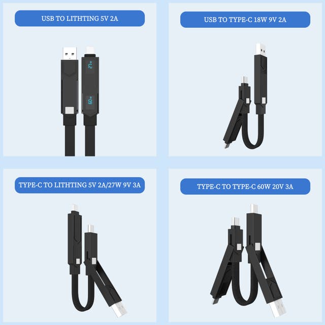 パターンは4種類で「Type-C to Lightning」「USB to Type-C」「USB to Lightning」「Type-C to Type-C」の充電やデータ転送をサポートできます。