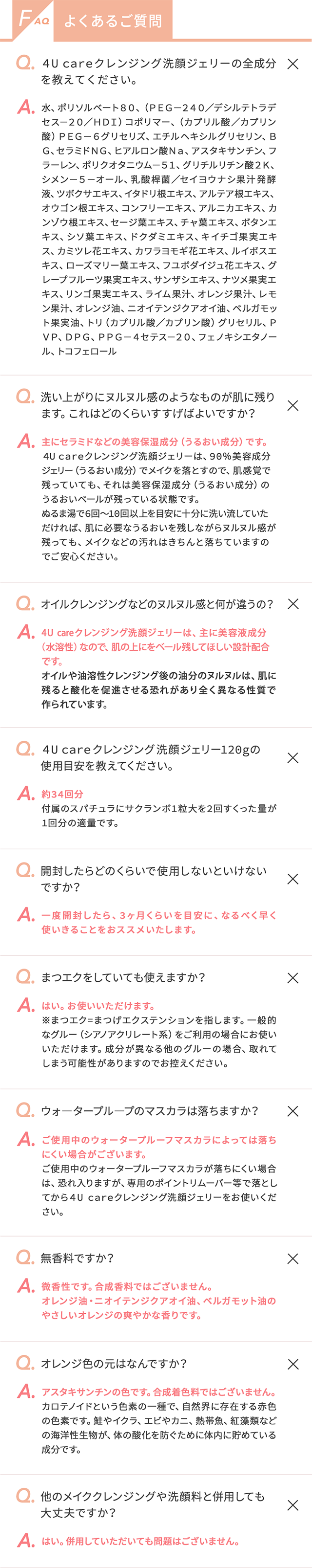 水、ポリソルベート80、(PEG-240/デシルテトラデセス-20/HDI)コポリマー、(カプリル酸/カプリン酸)PEG-6グリセリズ、フェノキシエタノール、エチルヘキシルグリセリン、オレンジ油、BG、ニオイテンジクアオイ油、ベルガモット果実油、トリ(カプリル酸/カプリン酸)グリセリル、グリチルリチン酸2K、シメン-5-オール、PPG-4セテス-20、乳酸桿菌/セイヨウナシ果汁発酵液、DPG、アスタキサンチン、アルテア根エキス、セラミドNG、ツボクサエキス、ポリクオタニウム-51、イタドリ根エキス、オウゴン根エキス、コンフリーエキス、PVP、アルニカエキス、カンゾウ根エキス、セージ葉エキス、チャ葉エキス、ヒアルロン酸Na、ボタンエキス、シソ葉エキス、ドクダミエキス、キイチゴ果実エキス、カミツレ花エキス、カワラヨモギ花エキス、ルイボスエキス、ローズマリー葉エキス、フユボダイジュ花エキス、グレープフルーツ果実エキス、サンザシエキス、ナツメ果実エキス、リンゴ果実エキス、ライム果汁、オレンジ果汁、レモン果汁、フラーレン、トコフェロール