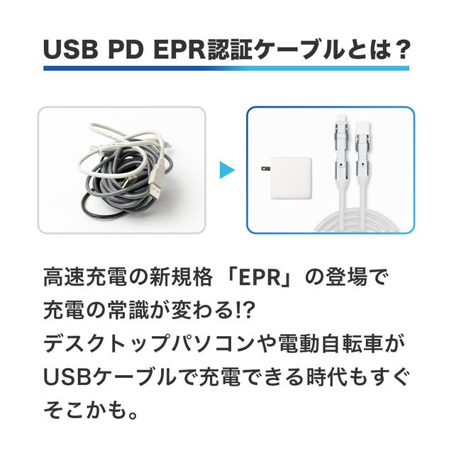 「マイクロライトニングケーブル」は「USB PD EPR(Extended Power Range)」対応により、最大PD240Wの高電力で接続機器への給電が可能です。