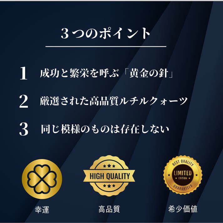 不純物が少なく、透明度が高いルチルクォーツ(金針線水晶)のその黄金の金針線の輝きは光の角度によって表情を変え、ただ美しいだけでなく、持つ人のエネルギーを増幅するかのような力を秘めています。私はこの石に込められた力を、挑戦を続ける起業家・自営業・営業職の方々、そして未来を切り拓こうとするすべての方に届けたいと考えています。温故知新の想いを胸に、古くからの伝統を守りながらも、新しい挑戦を後押しする特別な一石を、あなたの人生にお届けします。