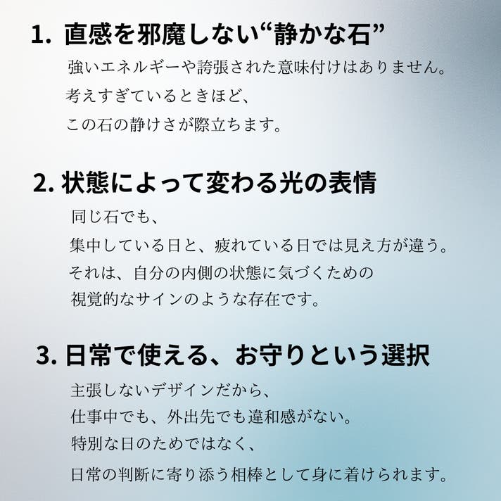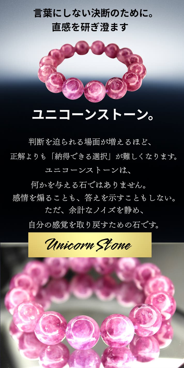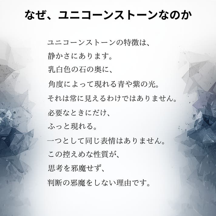 今回、紹介するのは「ユニコーンストーン」です。はっきりとした答えを与える石ではありません。けれど、心が揺れたとき、迷いが重なったときに、余計な感情を一つずつ静め、本来の自分に立ち返るための時間を与えてくれる存在だと感じています。派手な輝きや、強い主張はありません。だからこそ、日常の中で自然に身につけられ、気づけばそばにある、そんな石です。このユニコーンストーンが、選択に迷う瞬間や、立ち止まりたくなる日に、あなたの心にそっと寄り添うきっかけとなれば幸いです。