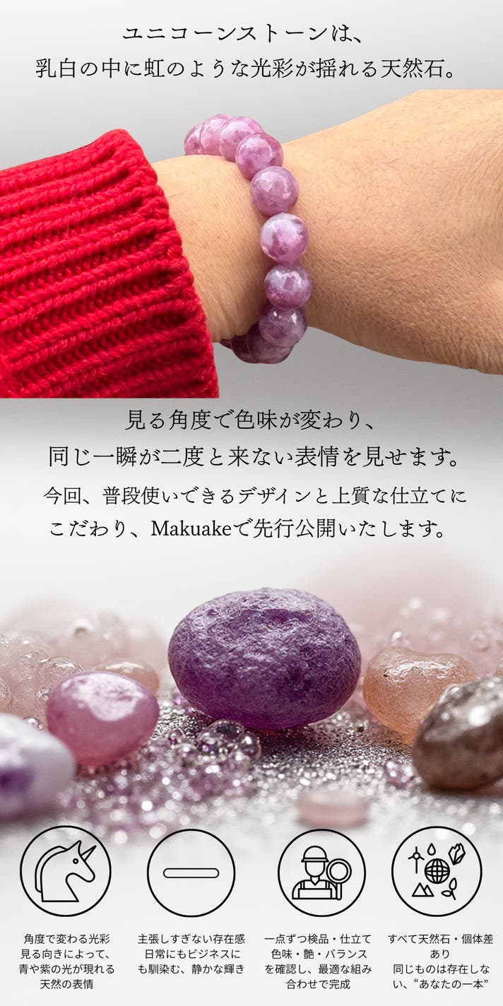 「Makuake(マクアケ)」は、実行者の想いを応援購入によって実現するアタラシイものやサービスのプラットフォームです。このページは、 ファッションカテゴリの 「光の角度で目覚める表情。 静かな自信を纏う、ユニコーンストーン。」プロジェクト詳細ページです。