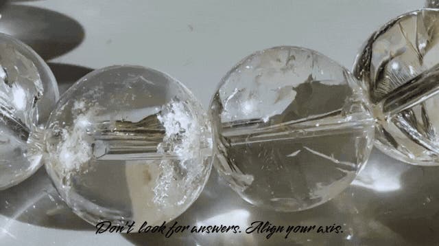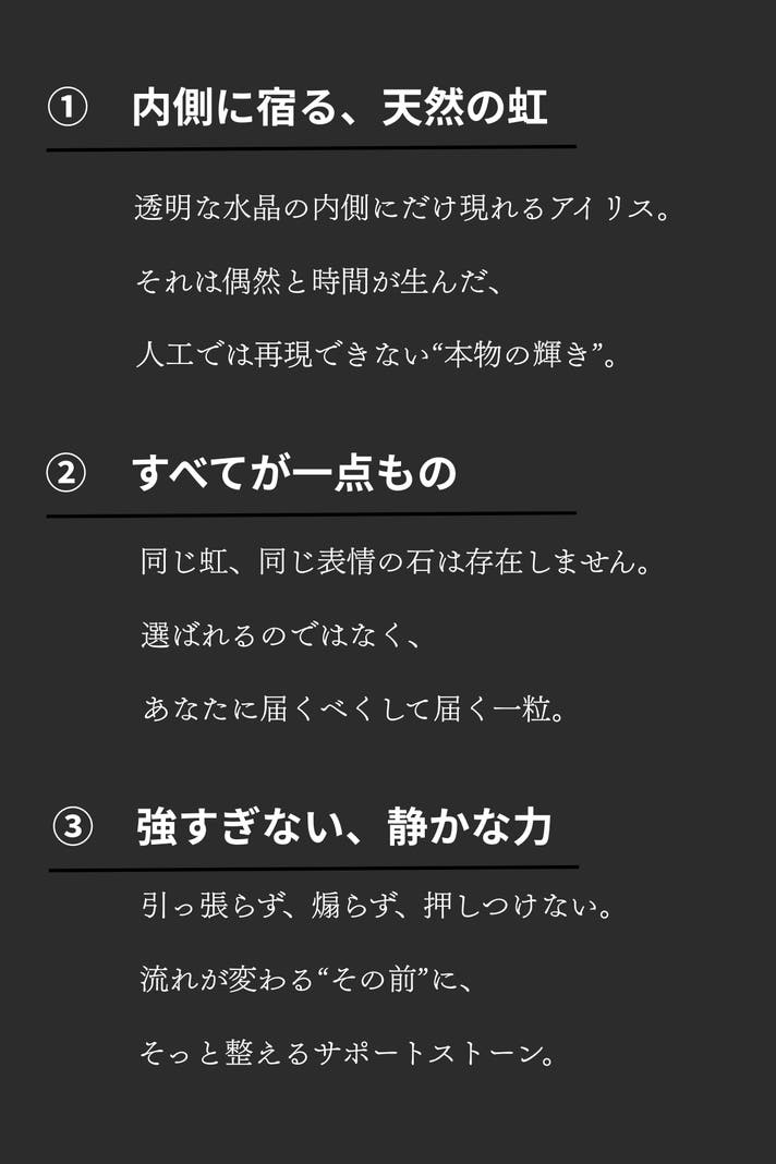 即効性や、明確な答えを与える石ではありません。しかし、判断が鈍るほど思考が重なったとき、感情と理性の境界が曖昧になったとき、透明な水晶の内側に現れる光は、ノイズからふっと距離を置き、自分の軸を再確認するための基準となってくれるでしょう。主張は控えめです。派手さや、力を誇示するような輝きもありません。それでも、光の角度によって確かに存在を示すその佇まいは、必要な場面でだけ、意味を持つ。日常に溶け込み、邪魔をしない。それでいて、判断を下す瞬間には、自分がどこに立っているのかを思い出させてくれる。このアイリスクオーツが、決断を迫られる場面や、立ち止まるべきか進むべきか迷うとき、感情ではなく、自分の軸で選ぶための静かな基準点となれば幸いです。