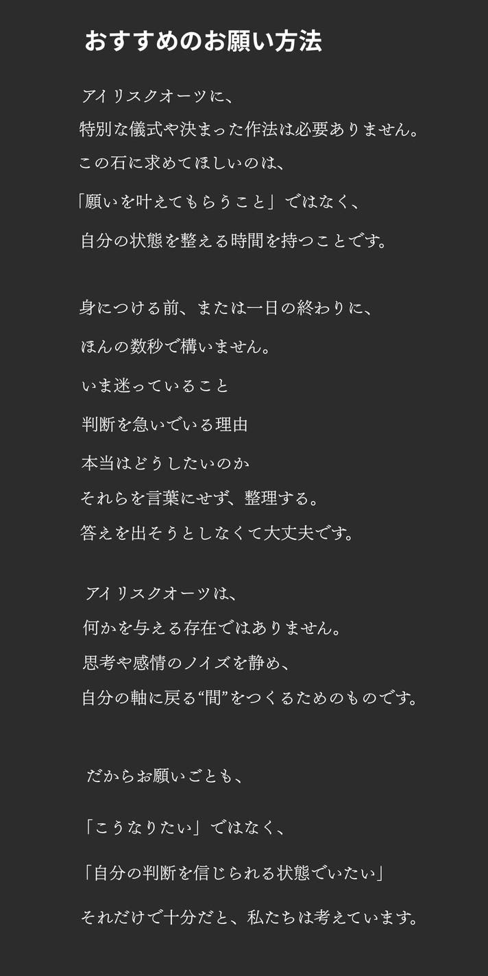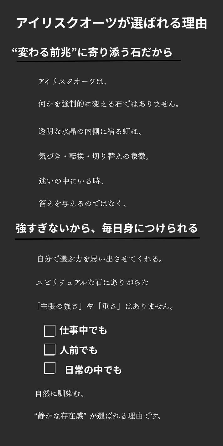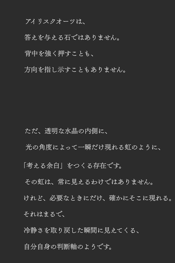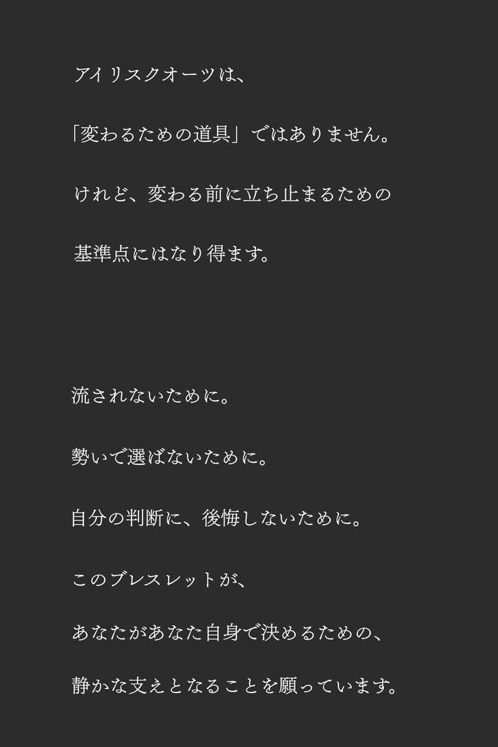 最後までご覧いただき、ありがとうございます。アイリスクオーツは、身につけた瞬間に何かを変えるためのものではありません。けれど、迷いの中で判断を下すとき、自分の立ち位置を静かに確認するためのひとつの「基準点」になり得る存在だと、私たちは考えています。流れに乗るためではなく、流されないために選ぶ。声を上げるためではなく、決断に集中するために身につける。このブレスレットが、