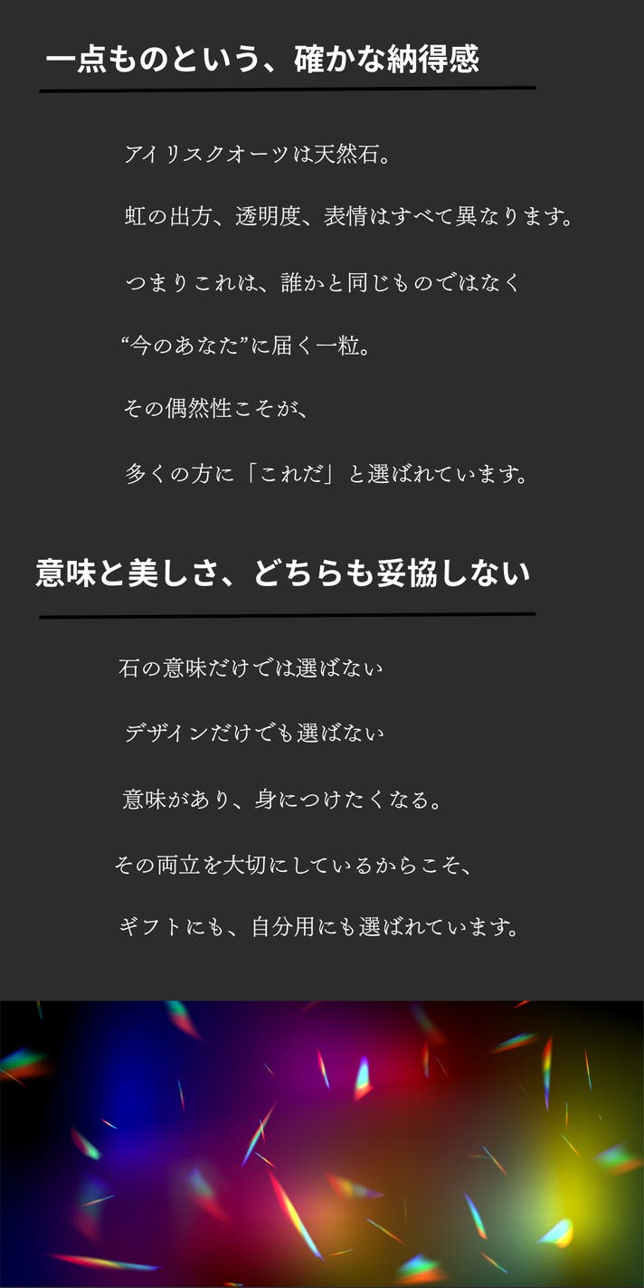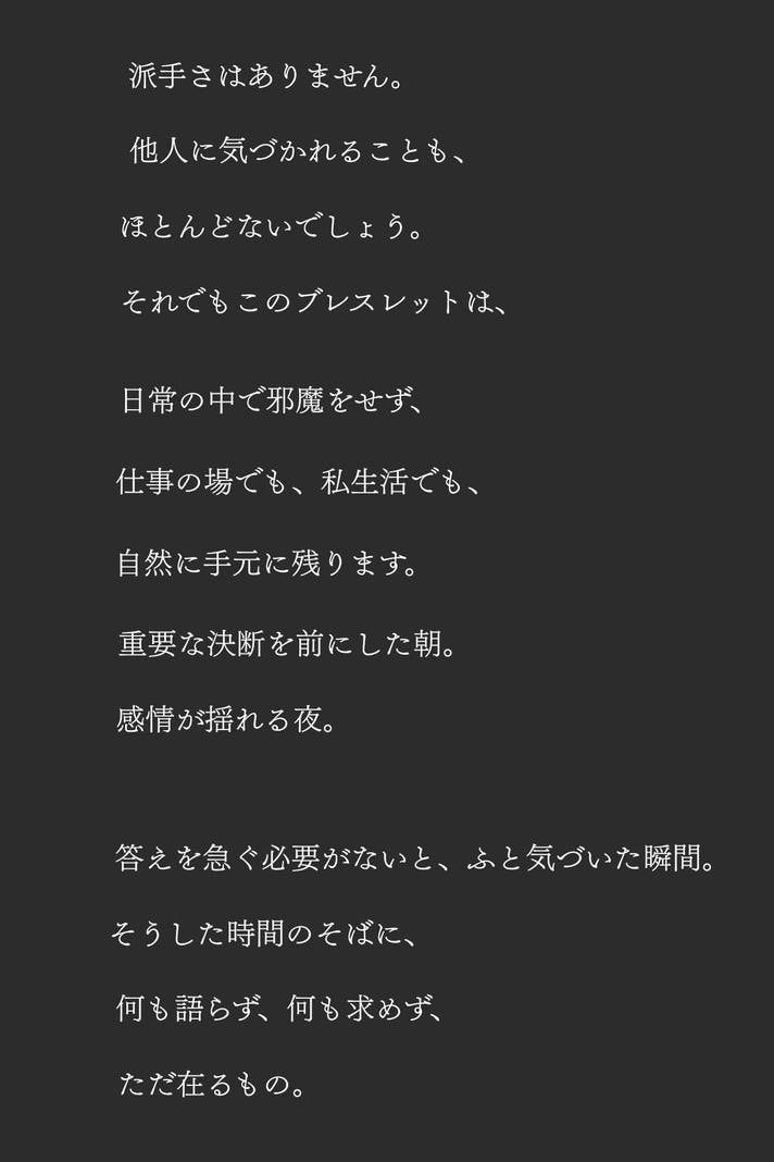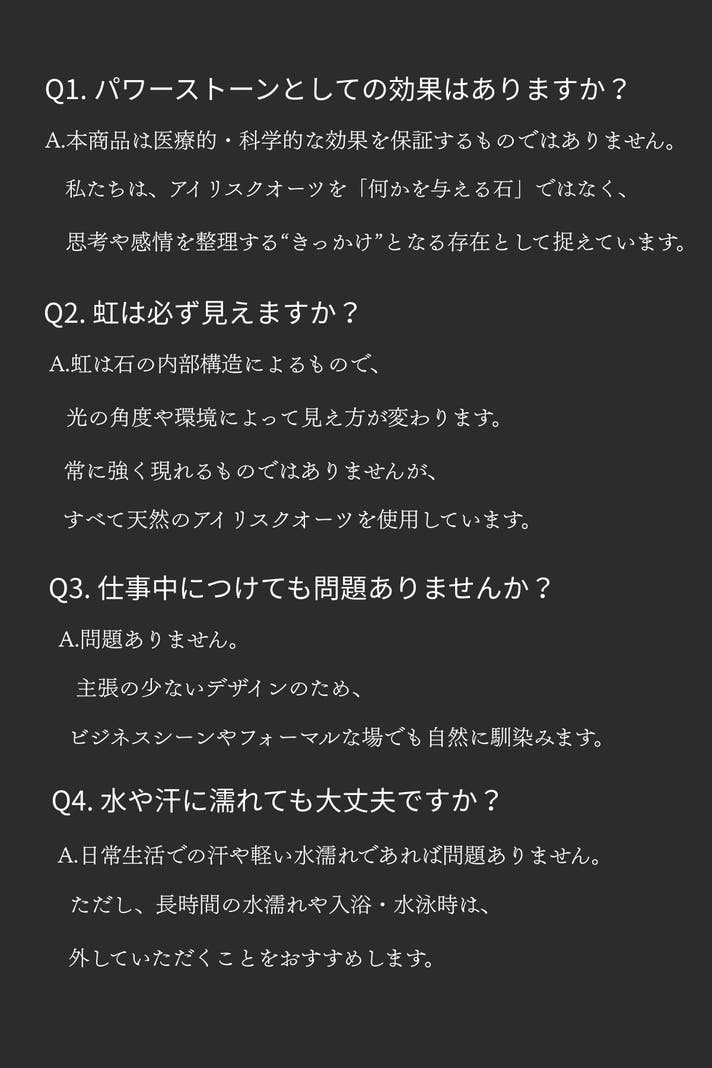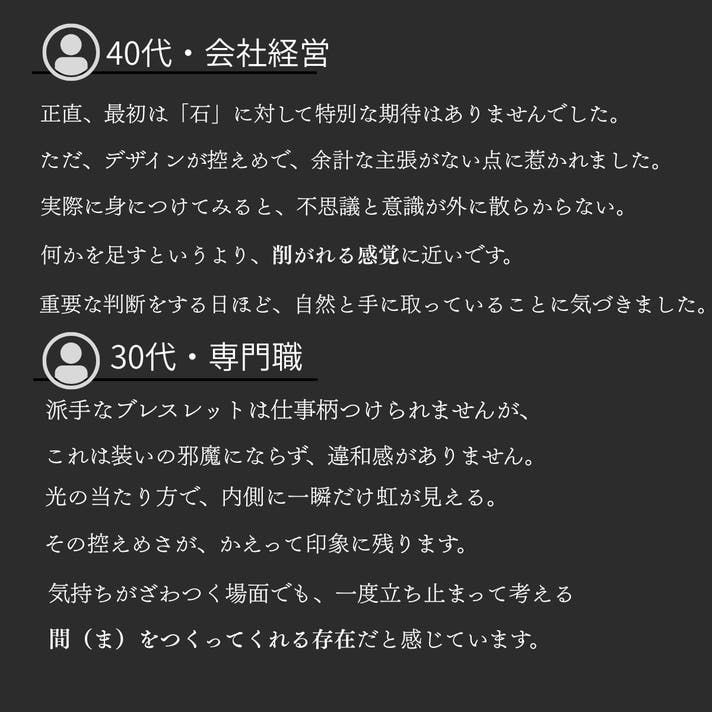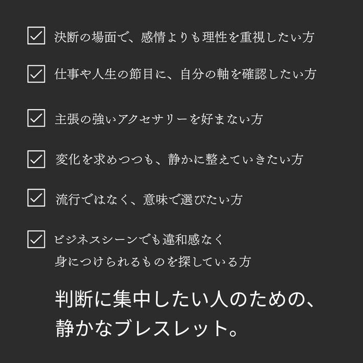 最後までご覧いただき、ありがとうございます。アイリスクオーツは、身につけた瞬間に何かを変えるためのものではありません。けれど、迷いの中で判断を下すとき、自分の立ち位置を静かに確認するためのひとつの「基準点」になり得る存在だと、私たちは考えています。流れに乗るためではなく、流されないために選ぶ。声を上げるためではなく、決断に集中するために身につける。このブレスレットが、