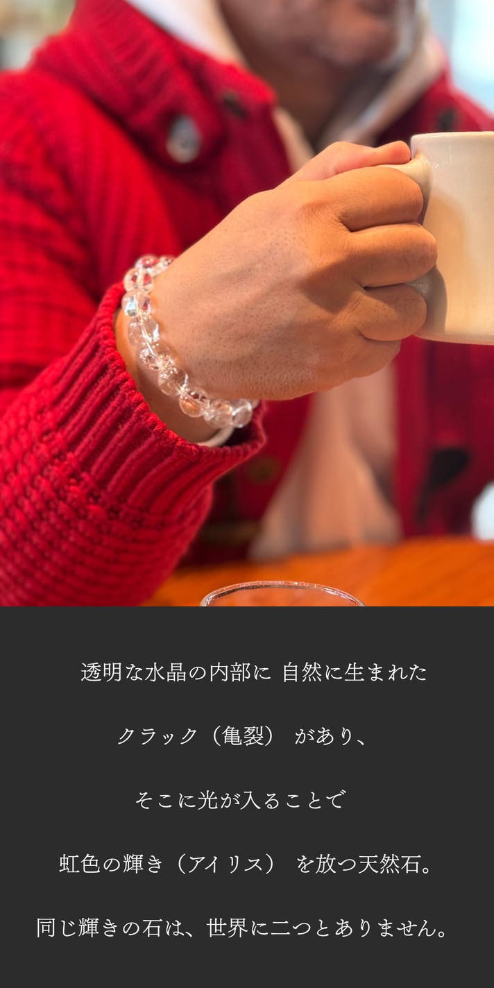 こんにちは、SEVEN STONESです。これまでマクアケにて、9件のプロジェクトを通じて、たくさんのご縁と応援をいただいてきました。私たちが一貫して大切にしているのは、流行や派手さではなく、日常に静かに寄り添うこと。そして、意味のあるものを、誠実にお届けすることです。今回ご紹介するアイリスクオーツも、そんな想いの延長線上で出会った一本です。透明な水晶の内側に、ふとした瞬間だけ現れる虹。