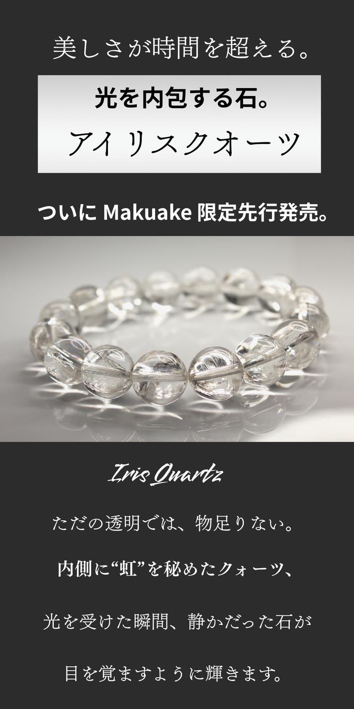 「Makuake(マクアケ)」は、実行者の想いを応援購入によって実現するアタラシイものやサービスのプラットフォームです。このページは、 ファッションカテゴリの 「ただの透明では、物足りない。 内側に“虹”を秘めたクォーツ、アイリスクオーツ。」プロジェクト詳細ページです。