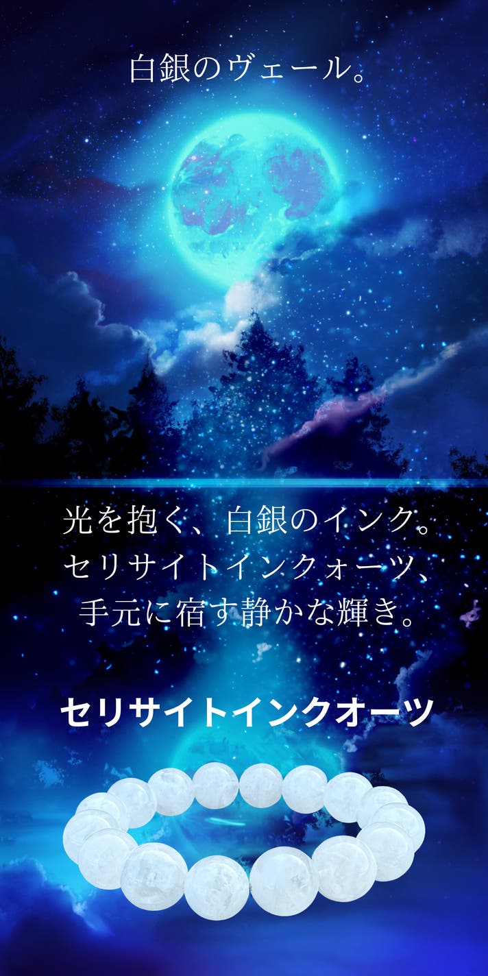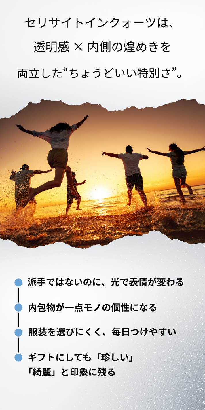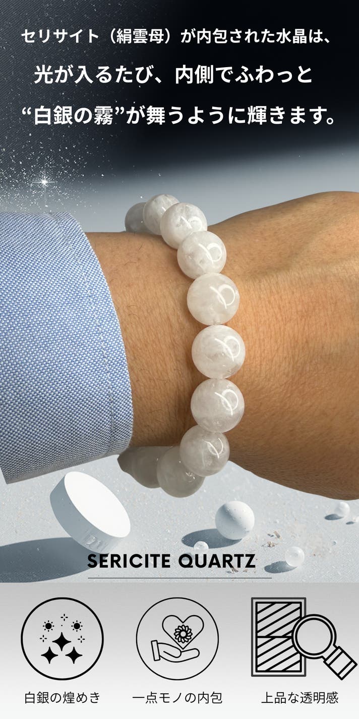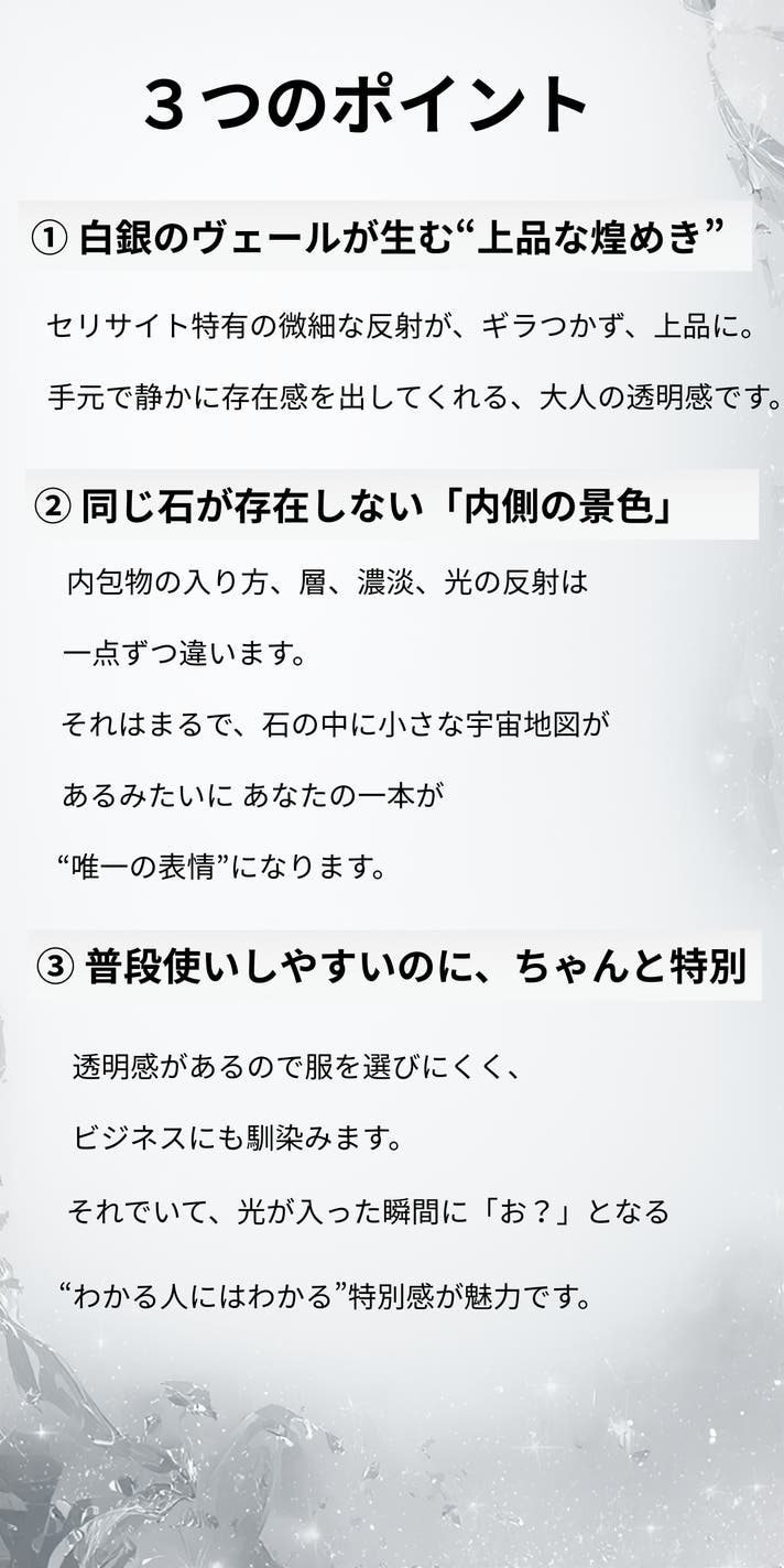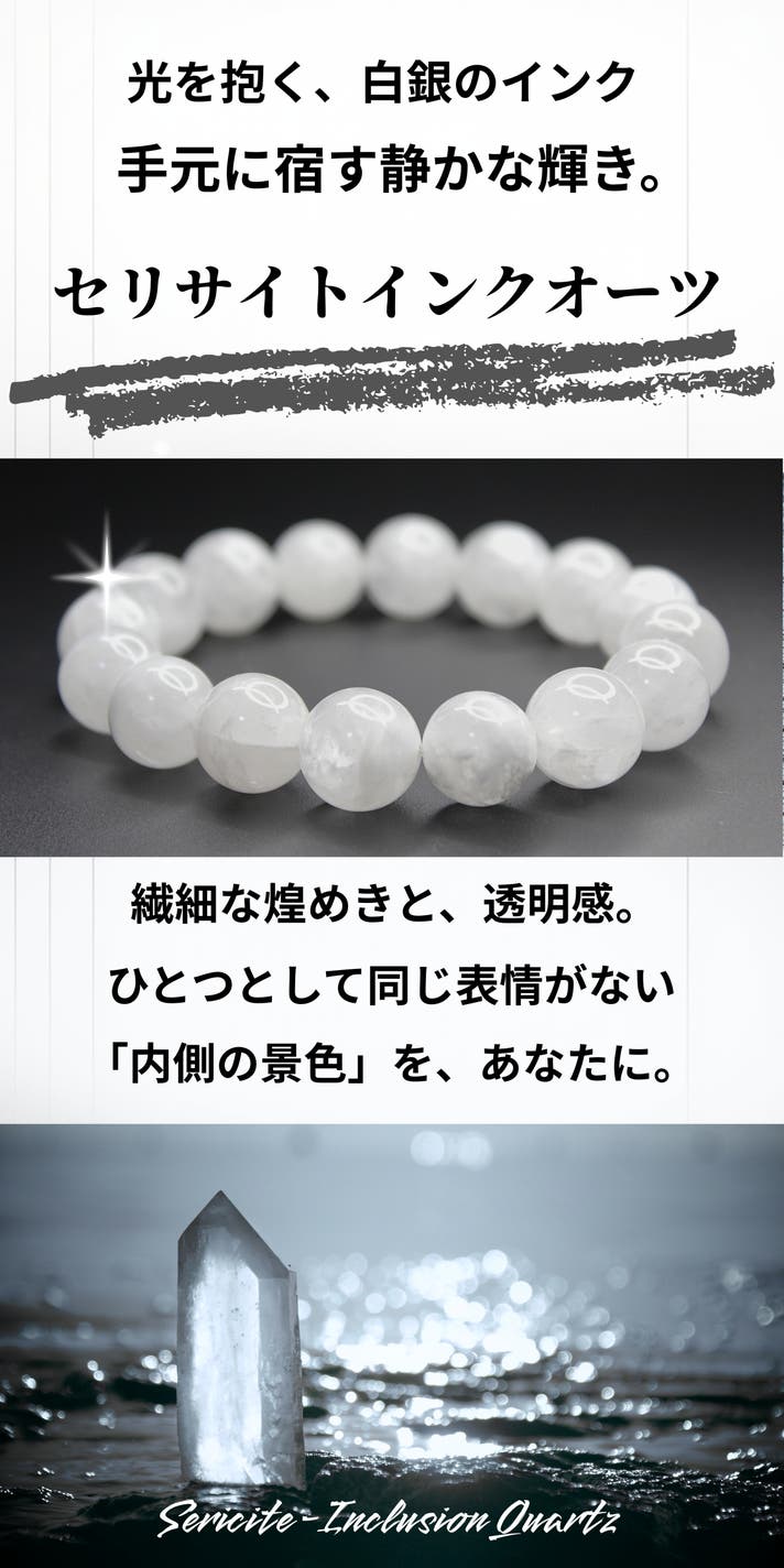 ギフトにもおすすめです。アクセサリーを贈ることに、少しだけ迷いを感じる方は少なくありません。派手すぎないか。相手の好みに合うか。気を遣わせすぎないか。セリサイトインクォーツは、そうした不安を抱えにくい石です。透明感のある水晶に、白銀のような内包が静かに広がる表情。色で主張することはなく、年齢や服装を選びません。だからこそ、贈る側の意図が、押しつけにならない。それが、この石がギフトに選ばれる理由です。
