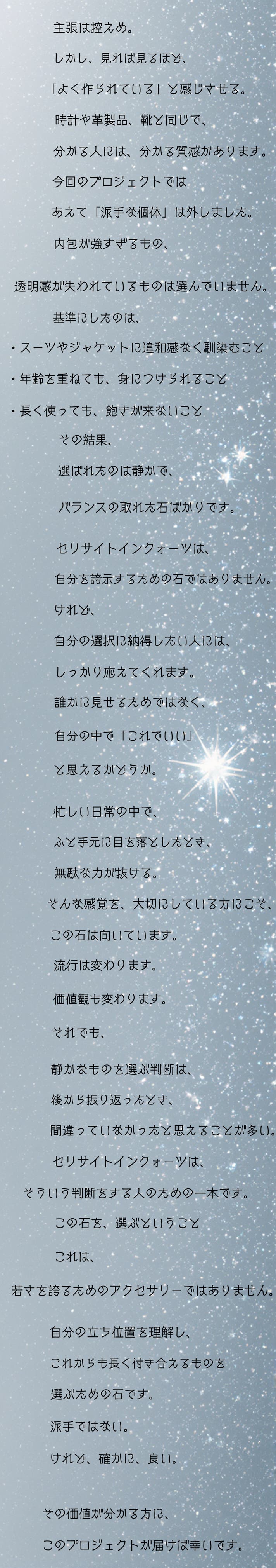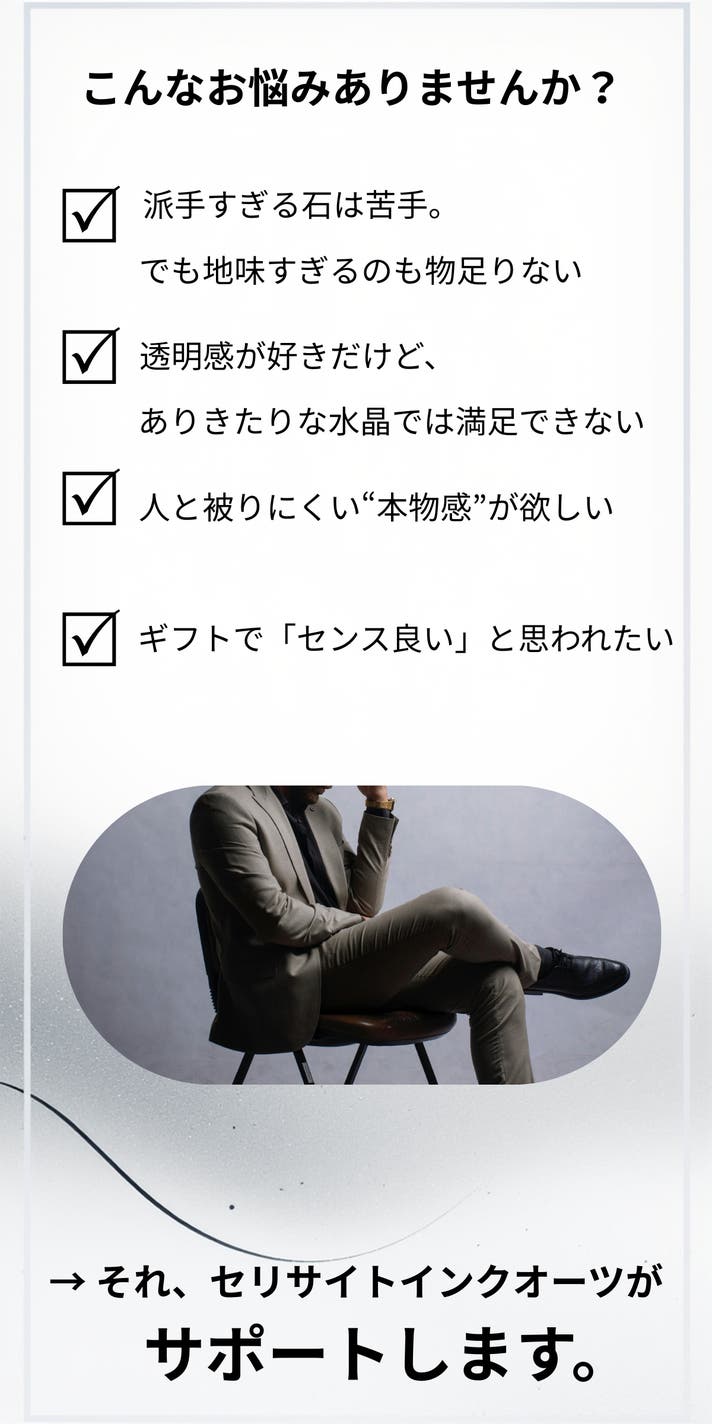 正直、最初は「派手さがない石だな」という印象でした。でも実物を見て、光の入り方で内側の表情が変わるのを見た瞬間、これは写真では伝わらないタイプの石だと感じました。仕事中でも違和感がなく、それでいて、ふと目に入ったときに気持ちが落ち着く。自己主張ではなく、自分の感覚を満たすための一本だと思います。