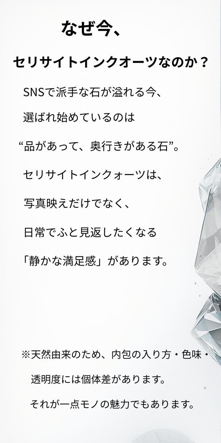 年齢的に、派手なアクセサリーはもう必要ないと思っています。このセリサイトインクォーツは、静かだけれど、確かに質がいいと感じました。内包の入り方が一つひとつ違っていて、「これは自分のものだ」と自然に思えるのも良いですね。長く付き合える石を探している人には、ちょうどいいと思います。