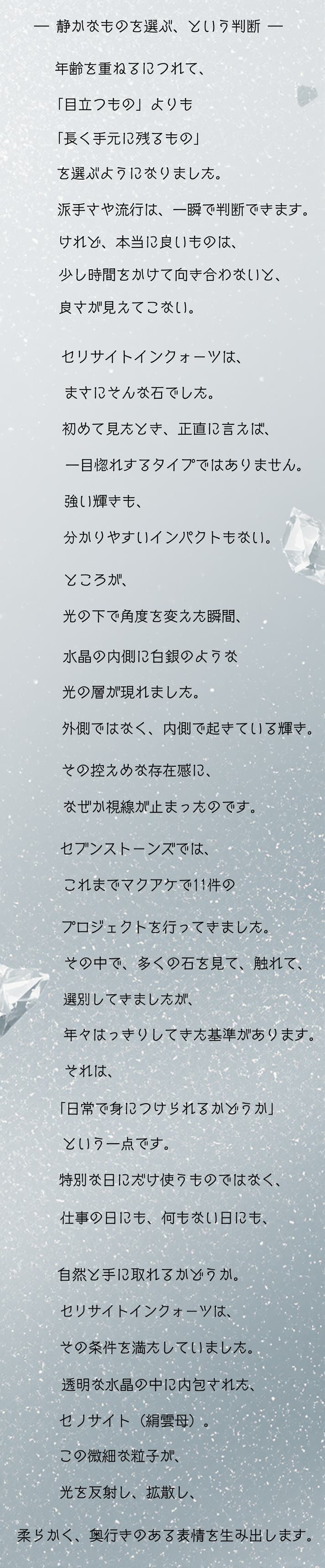 私たちはこれまで、マクアケにて合計11件の天然石プロジェクトを実施してきました。そのすべてが、サポーターさま一人ひとりの応援購入によって成立しています。流行だけを追うのではなく、「実際に手にしたとき、長く愛せるか」「日常で身につけたくなるか」この視点を何より大切に、石を選び、仕立て、届けてきました。今回ご紹介するセリサイトインクォーツも、写真映えより先に「実物を見た瞬間の感覚」を基準に選んだ石です。内側に静かに広がる白銀の輝き。派手ではないのに、ふとした瞬間に目を奪われる存在感。11件のプロジェクトで積み重ねてきた経験を活かし、今回も一点一点、表情を見極めたものだけをお届けします。これまで応援してくださった方にも、今回初めてセブンストーンズを知ってくださった方にも、「応援購入してよかった」と思っていただけるプロジェクトを目指します。どうぞ最後までご覧ください。