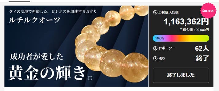 本文中に記載させていただいたスケジュールは、あくまでプロジェクト公開時点の予定です。 応援購入の性質上、配送遅延のおそれがございますが、気持ちよくお使いいただけますように精一杯発送完了までご対応させて頂きます。 原則として、配送遅延に伴う応援購入のキャンセルはできませんが、 リターン配送予定月から 3ヶ月 を超えた場合には、希望者に限りキャンセルにて対応させていただきます。 ※商品の仕様、デザイン、色合いに関しましては一部変更になる可能性もございます。 ご了承くださいませ。 ※商品の性質上、立証が困難なためお守り同様、効果を保証する物ではありません。 ・一部国内に類似商品が出回っている場合がございます。弊社では他社類似品に関してのお問い合わせには対応できませんのでご了承下さい。 原則として、サポーター都合によるキャンセル・返金は承っておりません。 (サポーター都合のキャンセル不可の例:サイズが合わない、誤注文、長期不在) ◾️対応条件: 商品の初期不良、またはお届けした商品がご注文内容と異なる場合、到着後14日以内にプロジェクトページの「実行者にメッセージ」よりご連絡ください。状況を確認の上、返金対応、または良品との交換対応をさせていただきます。 ◾️返金額: リターン金額(税込)の全額 ◾️返品送料/再送料: 実行者負担 【返品・交換をお受けできない商品】 ・サポーターの責任により破損、汚損が生じた商品 ・商品のタグ、付属品、パッケージ(箱、袋など)を紛失、破棄された商品 ・事前にご連絡をいただいていない商品 ・商品到着後、15日以上経過した商品 【交換をお受けできないケース】 ・限定品や同一商品の在庫がない場合など、代替品をご用意できない商品