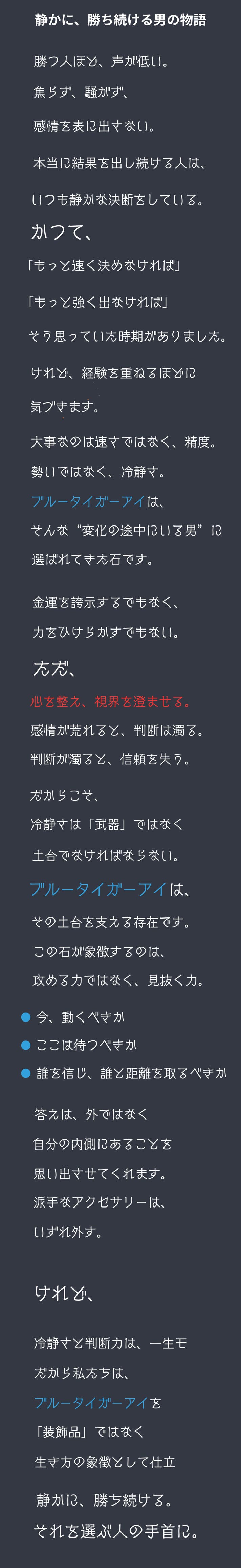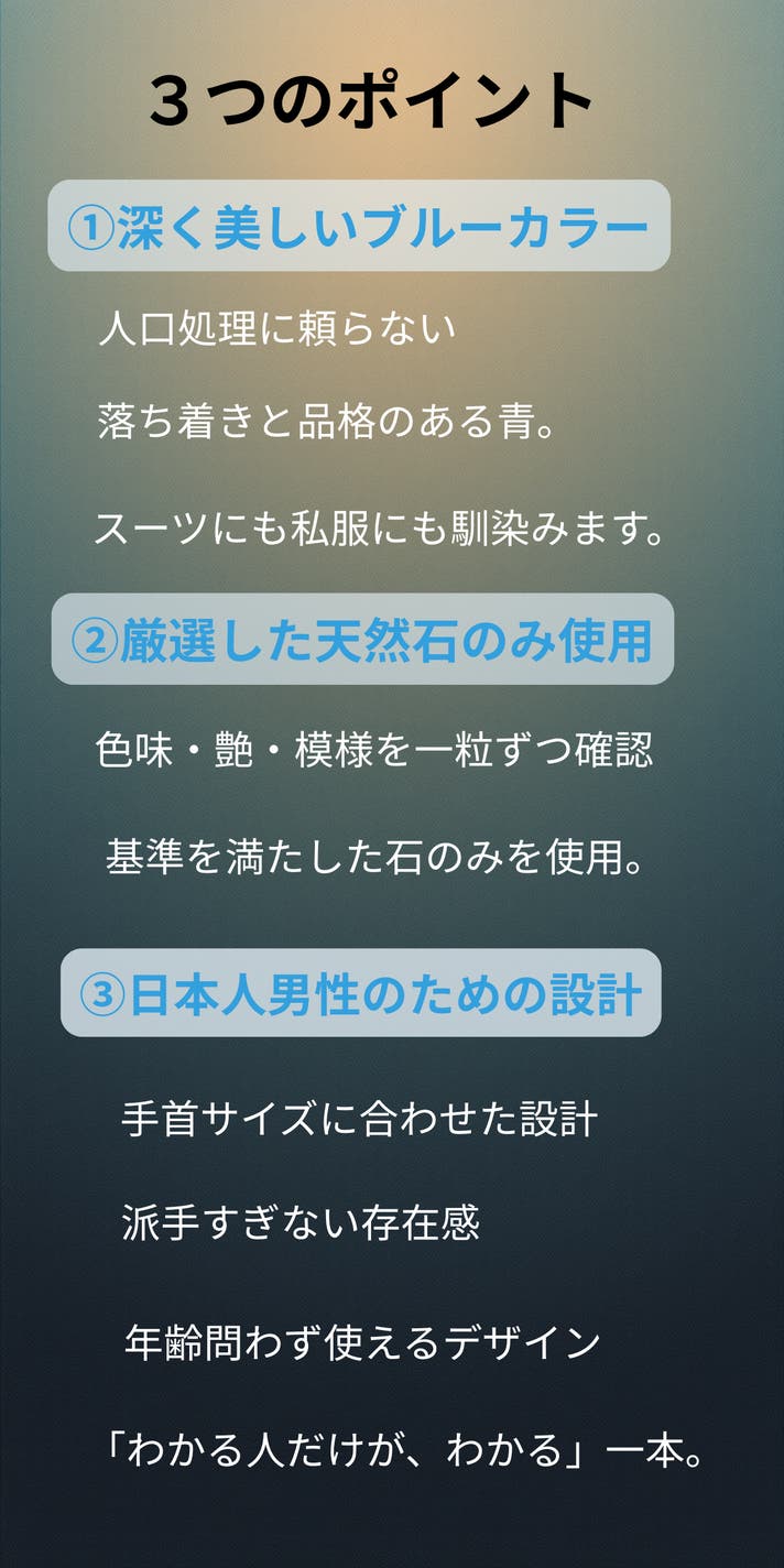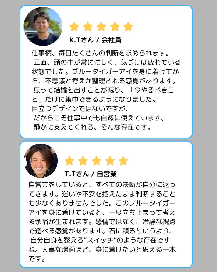 派手さではなく、整った印象を残す“青の深さ”にありました。アクセサリーは身に着けることで何かを誓ったり、気持ちを切り替えたりする「スイッチ」になるもの。だからこそ私たちは、毎日使えて、生活の邪魔をしない形にこだわっています。Makuakeでは、「買って終わり」ではなく、使うほどに自分に馴染んでいく体験を届けたい。ブルータイガーアイが、あなたの大切な一日や、勝負の日のそばにある存在になれば嬉しいです。