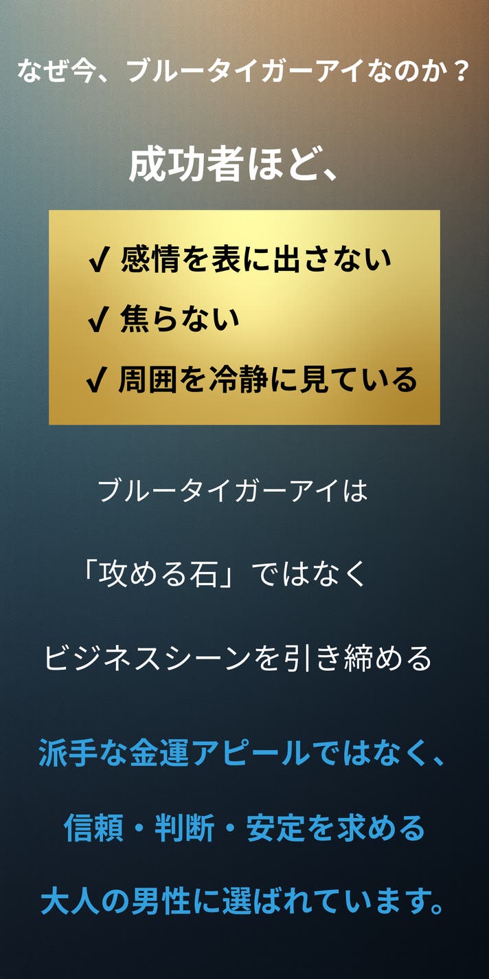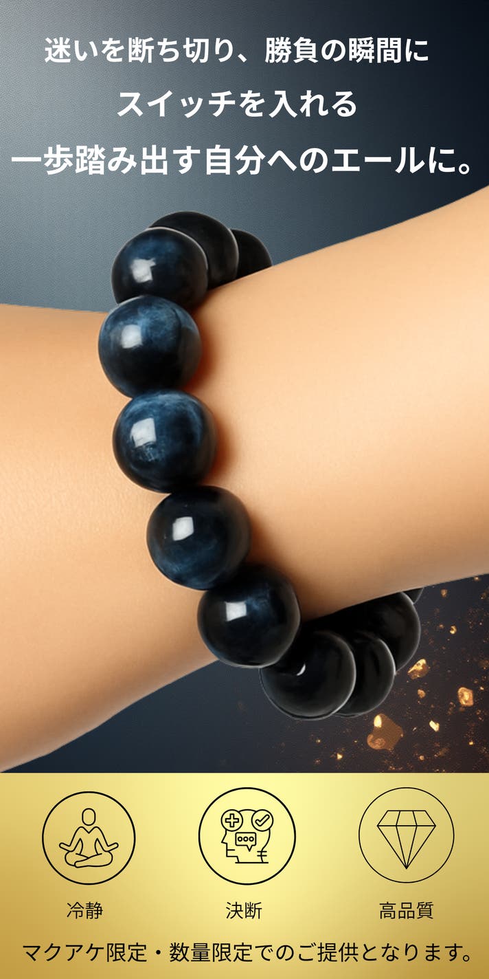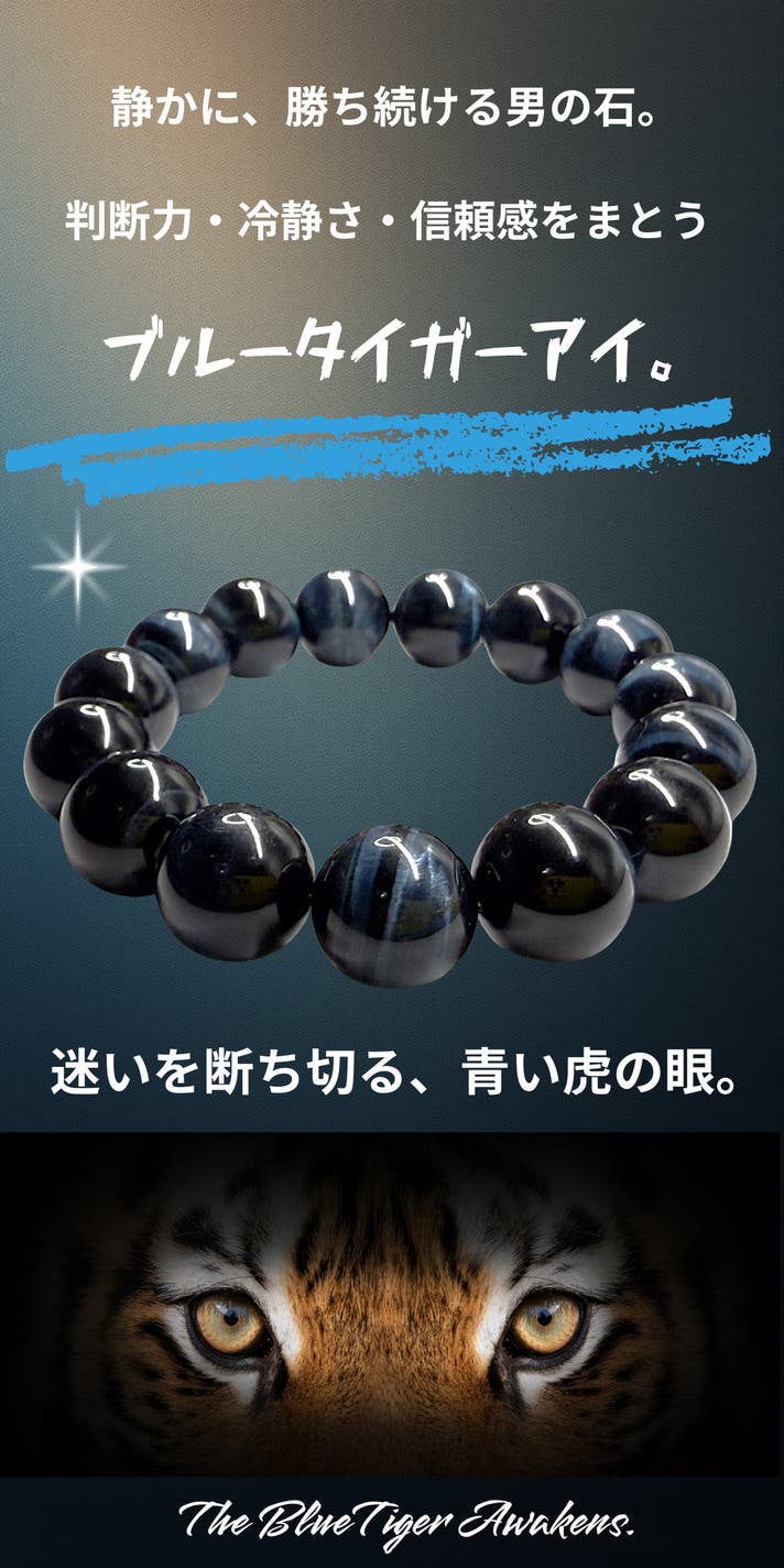 今回ご紹介するのは、ブルータイガーアイ。華やかさで語る石ではありません。この石が持つのは、静けさの中にある強さです。本当に進むべき方向を見失わないための石。忙しさや情報に追われる現代だからこそ、「何もしない強さ」「揺れない判断力」が、人生を大きく左右すると私たちは考えています。このブルータイガーアイは、決断の場面に立つ方、集中力と冷静さを求める方、そして自分自身を信じて前に進みたい方のために選び抜きました。ただのアクセサリーではなく、あなたの思考と在り方に寄り添う存在として。ぜひ、このプロジェクトを通じて、ブルータイガーアイの静かな力を感じていただけたら幸いです。