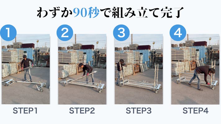 A. はい、現実的です。普段から足場工事に従事されている方であれば、慣れた足場材の組み立て技術をそのまま活用できるため、90秒での組み立てが可能です。初回使用時は多少時間がかかる場合がありますが、慣れれば60秒以内での組み立ても可能になります。