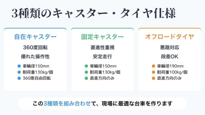 A. はい、可能です。各ユニット(自在キャスター、固定キャスター、オフロードタイヤ)の追加購入や交換が可能です。現場条件の変化に応じて最適な組み合わせに変更していただけます。