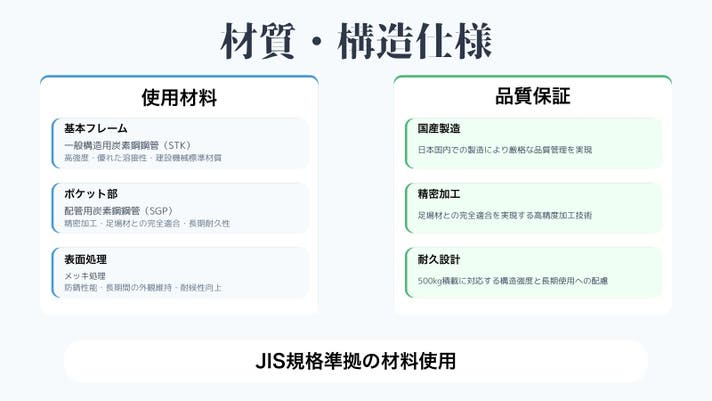 A. 足場材を使用した台車のカスタマイズ構造について実用新案を出願中です。詳細については出願内容の関係上お答えできませんが、独自の技術により他社製品との差別化を図っています。