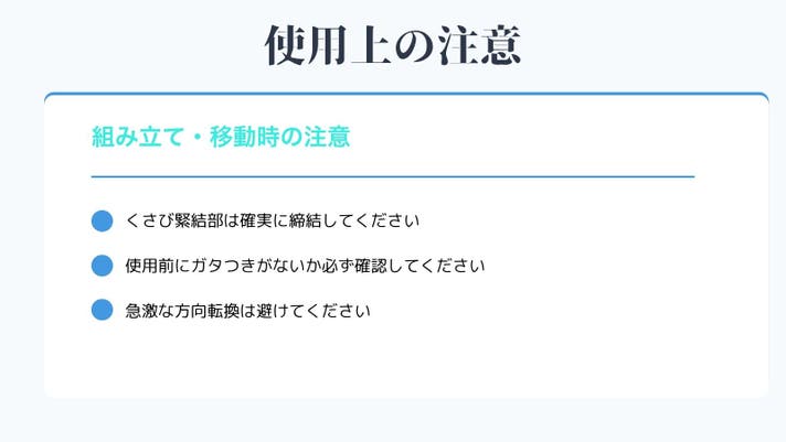 A. キャスターやタイヤは消耗品となります。使用頻度や現場条件により異なりますが、一般的に1-2年程度が交換の目安です。異常な摩耗や動作不良が見られた場合は早めの交換をお勧めします。