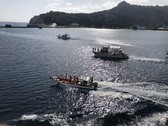 おがさわら丸の出航と同時に港を出て、「いってらっしゃい!」と送り出してくれるのです。