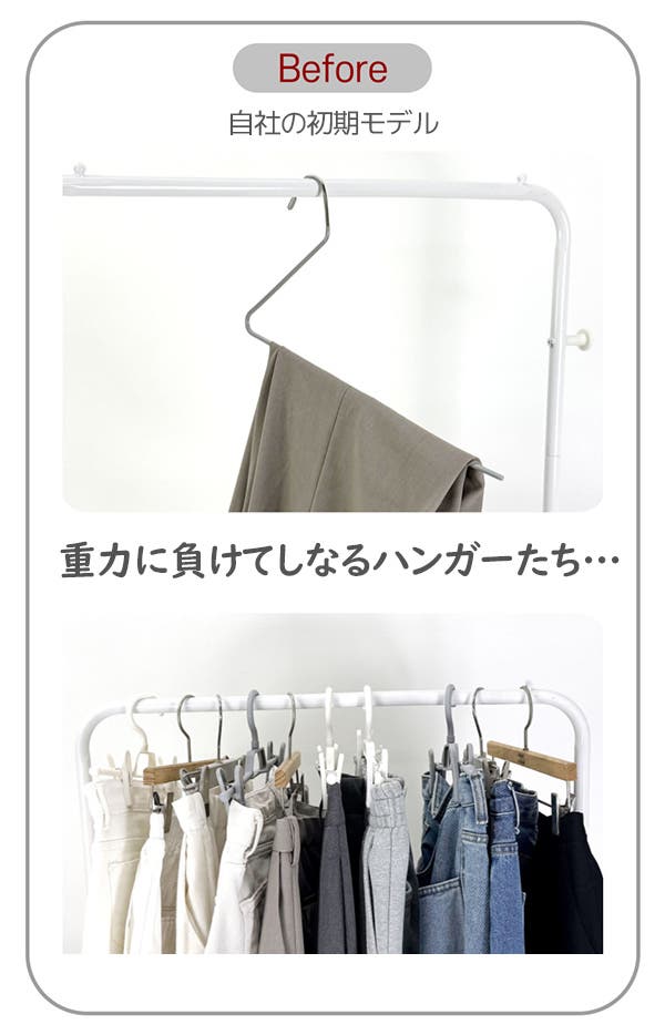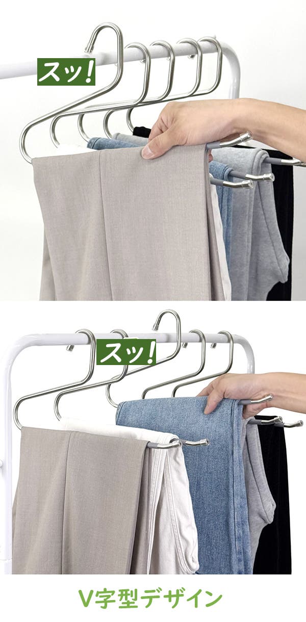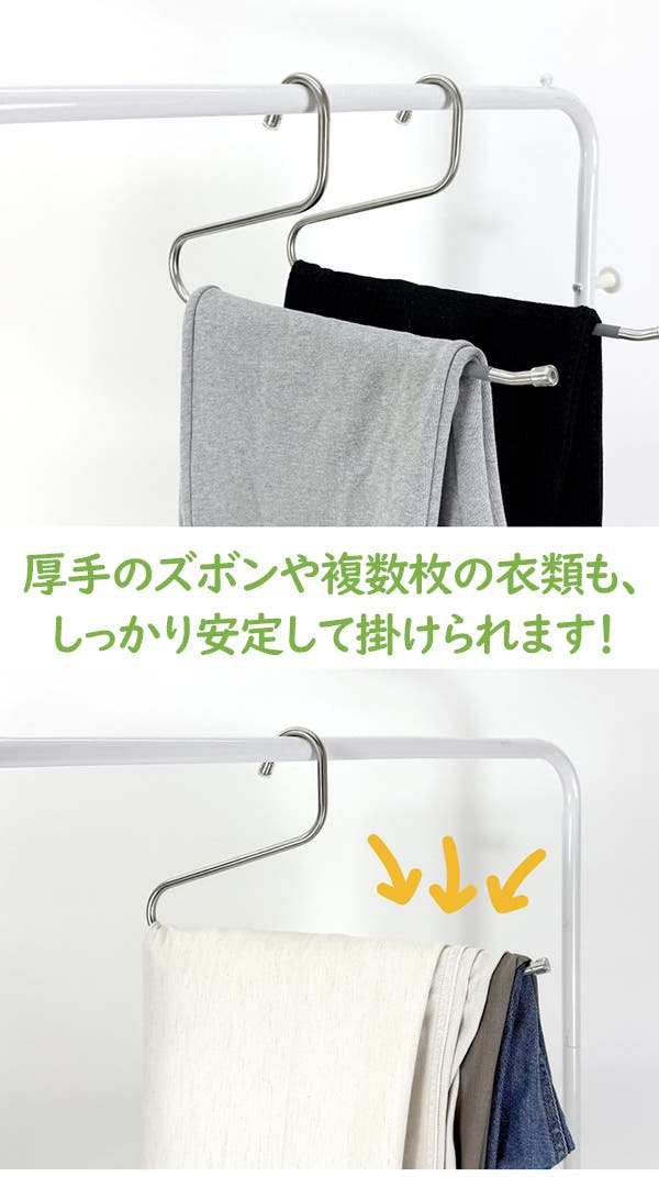 厚手のズボンや複数枚の衣類も、しっかり安定して掛けられます!