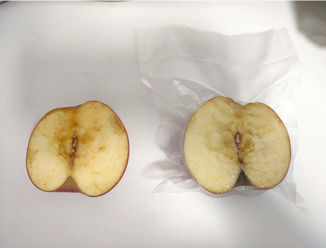 りんごを二等分して一つを真空パックに、もう一つを何もせずそのまま放置した3日後の様子をご覧ください。