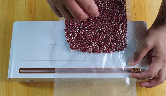 A1:エンボス加工等が施された表面にざらつきのある袋や、折り込みがあり端に厚みのある袋には真空加工およびシールをすることができますが、薄くて表面がつるつるしたビニール袋等は真空加工には使用できませんのでご注意ください。
