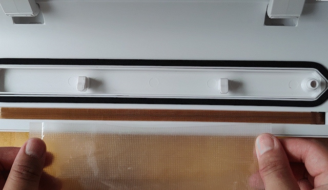 より使いやすくするため、909Dの内部に2つのカードスロットが設計されています。真空処理をする際、袋の端をカードスロットに置くだけで完了です。袋と本体がずれないように気を使う必要はありません。