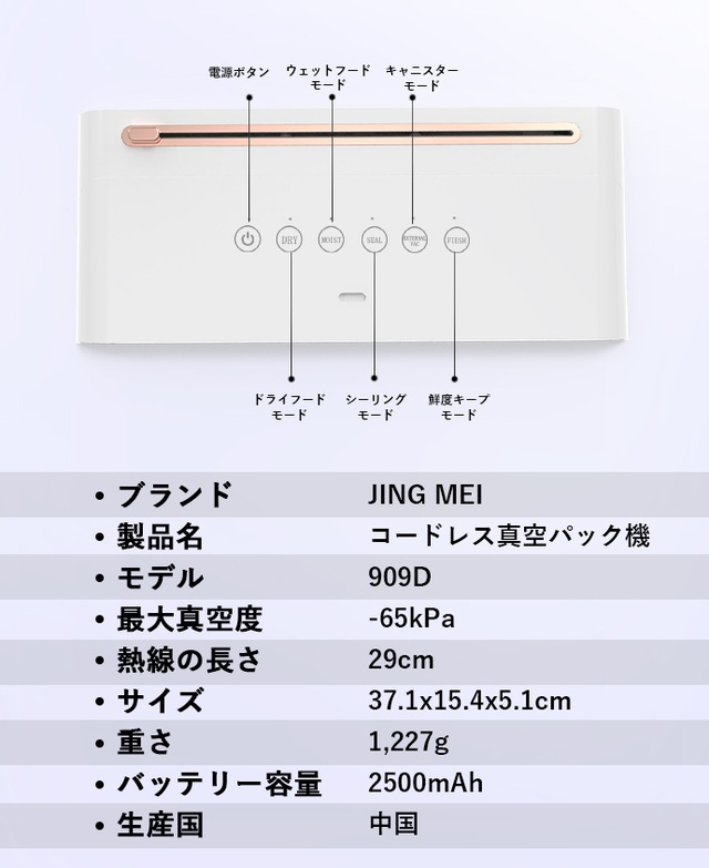 コード付きの真空パック機の最大の欠点は、電源がないと使用できず、使用場所が限られてしまうことです。909Dを使うとこのような悩みから解放されます。2500mAhのバッテリーが内蔵されており、電源がなくても真空パックが可能です。