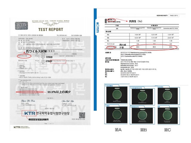 抗ウィルス性試験では、特定の菌に対して99.9%除去の結果が示されました。