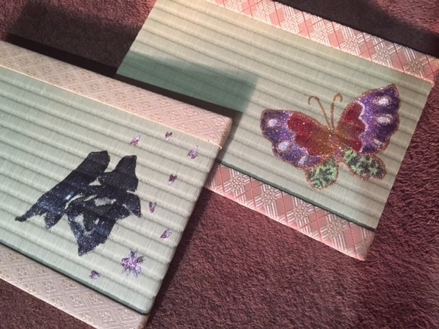 他にない畳を利用した写真フレームにキラキララメの和柄アートは世界にひとつ、また畳の縁を利用、「ご縁」という世界にひとつの「畳字」