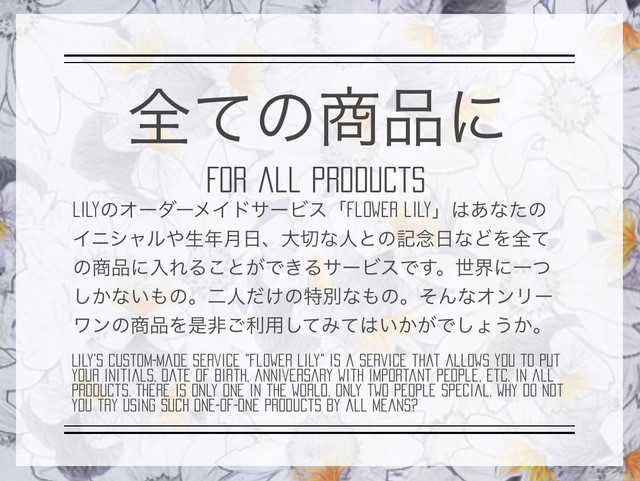 Lilyが行なっているオーダーメイドサービス「Flower Lily」は柄やモチーフの中にお客様のイニシャルや記念日、一言メッセージなどを落とし込み、デザインとして商品の中に溶け込ませます。