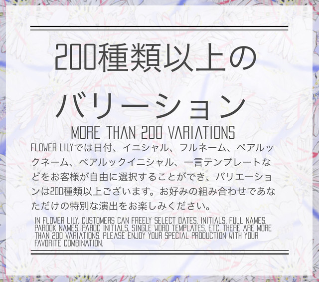 Flower Lilyでは約200種類以上のバリエーションの中からお客様の最適なデザインを見つけることができます。「イニシャルに記念日も添えたい」「ロゴ部分にそっと一言メッセージを添えたい」など、様々なご要望にお答えします。