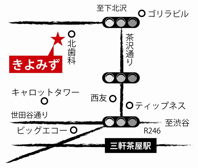 三軒茶屋駅北口Aを出て茶沢通りを下北沢方向へ、ゴリラビル(1階ファミリーマート)を左折、北歯科の隣 徒歩7分