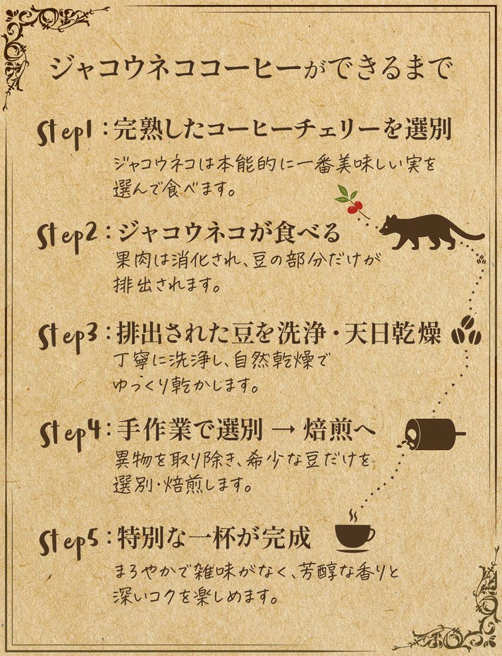 原料 :アラビカ種95%、ジャコウネココーヒー5%