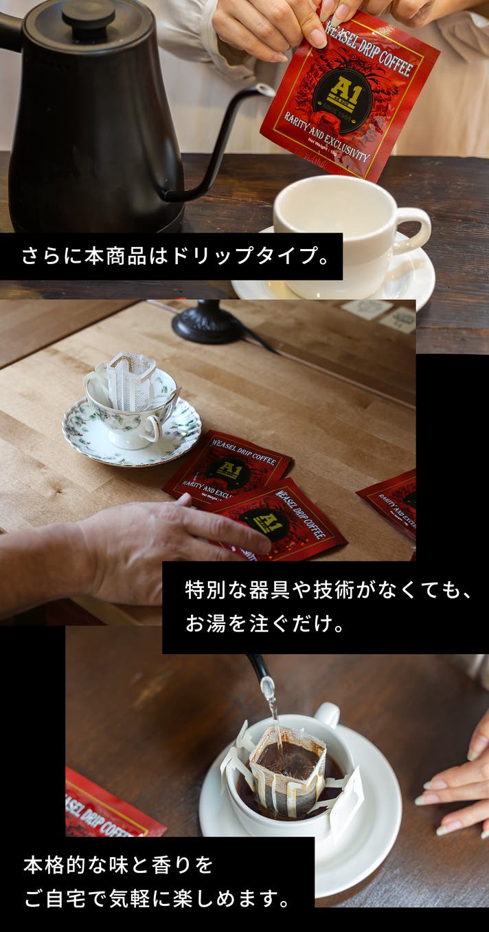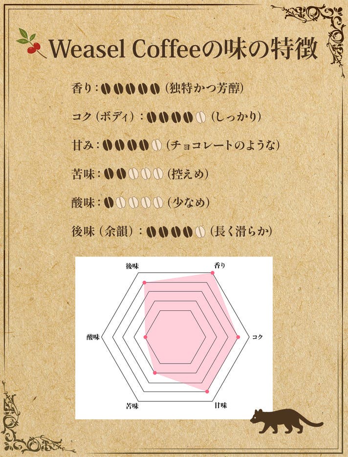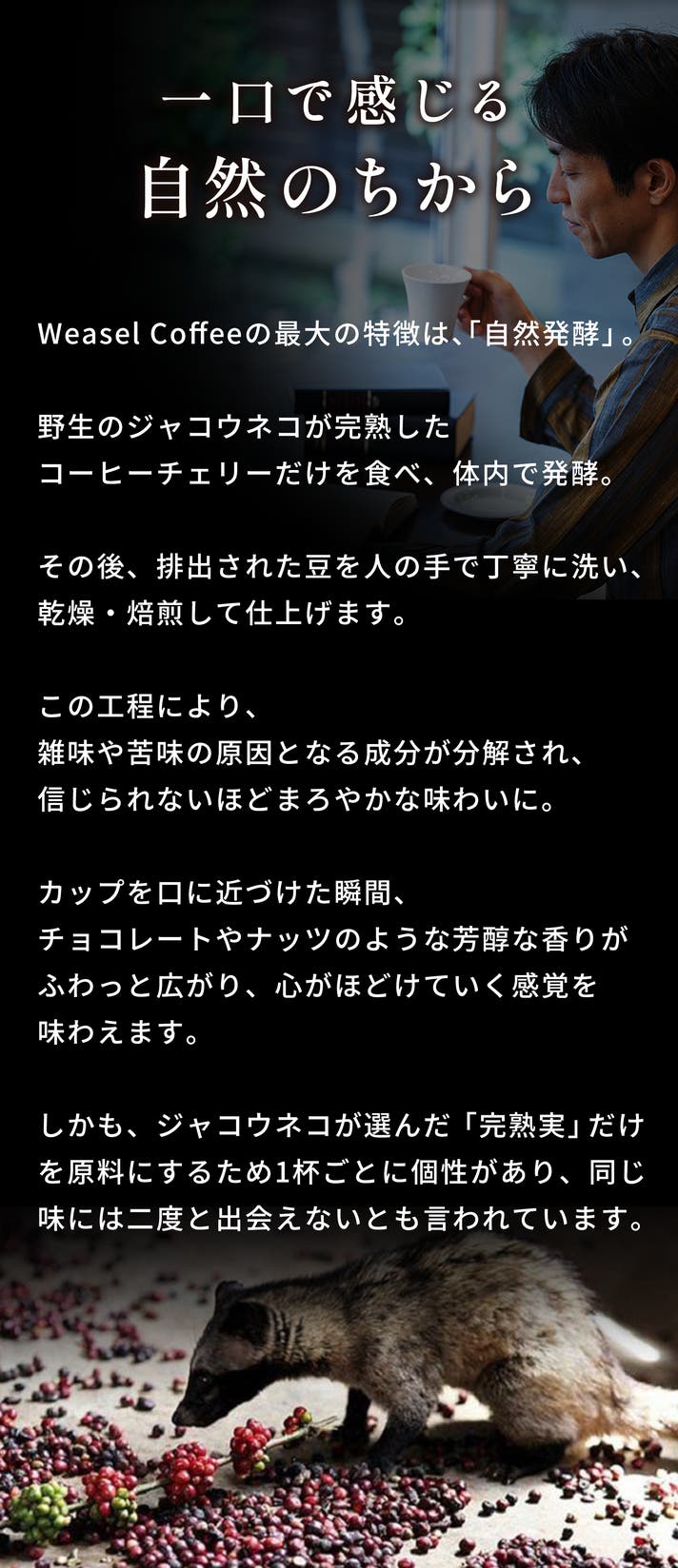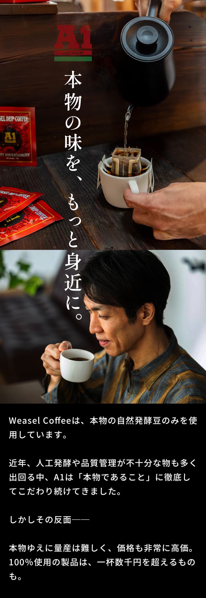 そんなA1が厳選し、日本で初めてお届けするのがこのWeasel Coffeeです。
