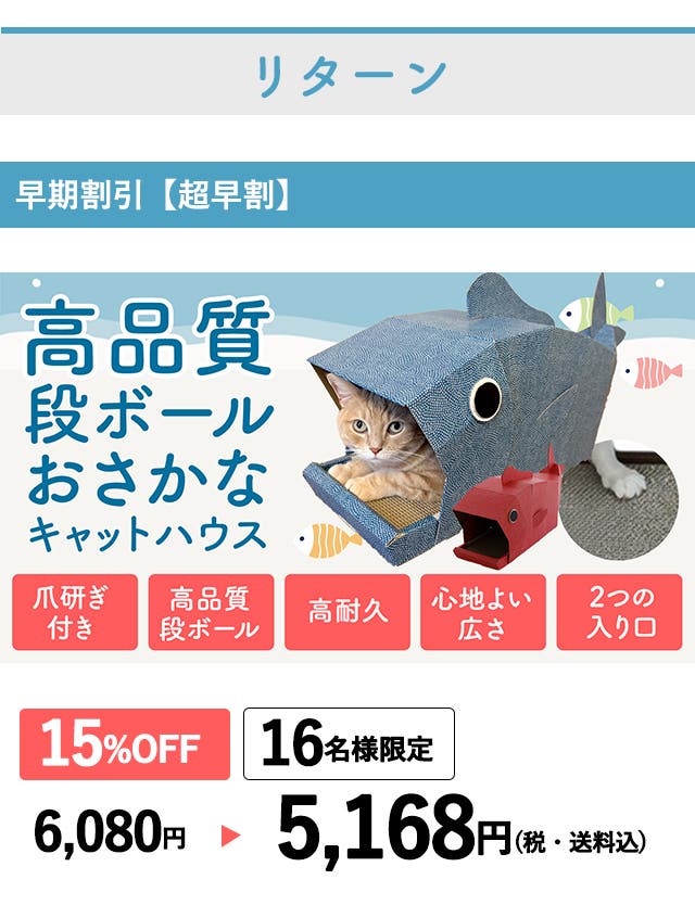 ご注文状況、製造工程上の都合等により出荷時期が遅れる場合があります。 製造スケジュールについては、現在プロジェクト成功を想定した数で調整しておりますが、想定を上回る応援購入の申し込みがあった場合、製造工程上の都合や配送作業に伴う止むを得ない事情によりお届が遅れる場合がございます。 最後に【おさかなキャットハウス】を手に取った皆様に喜んでもらえるよう、チームメンバー一同心を込めて対応していきますので、応援よろしくお願い致します。 本文中に記載させていただいたスケジュールは、あくまでプロジェクト公開時点の予定です。 応援購入の性質上、配送遅延のおそれがございます。 原則として、配送遅延に伴う応援購入のキャンセルはできませんが、 リターン配送予定月から 1ヶ月 を超えた場合には、希望者に限りキャンセルにて対応させていただきます。