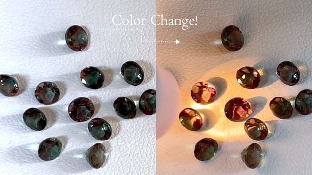 一般的な宝石と違い変色効果のある宝石は、吸収する色の波長が異なるため、異なった石のように、私達には色が違って見えます。