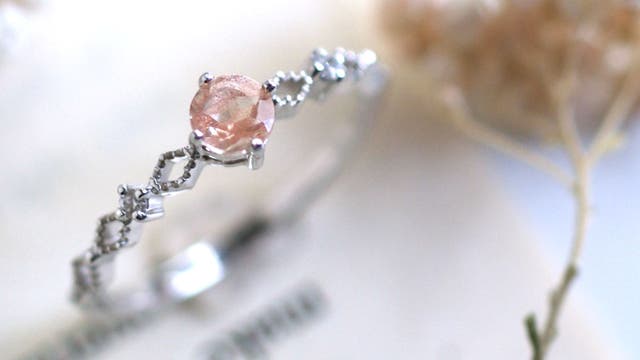 地色はオレンジ~レッド、イエロー、グリーン、ベージュ、カラーレスなど様々で、今回のリングにはサーモンピンクのルースを使用しています。