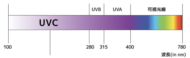 紫外線は 波長別に315~400nmの「UV-A」、280~315nmの「UV-B」、100~280nmの「 UV-C 」の3種類に分類されます。このうち最もエネルギーが高く、強い除菌力持つのがUV-Cで、ウイルスを除去することができます。