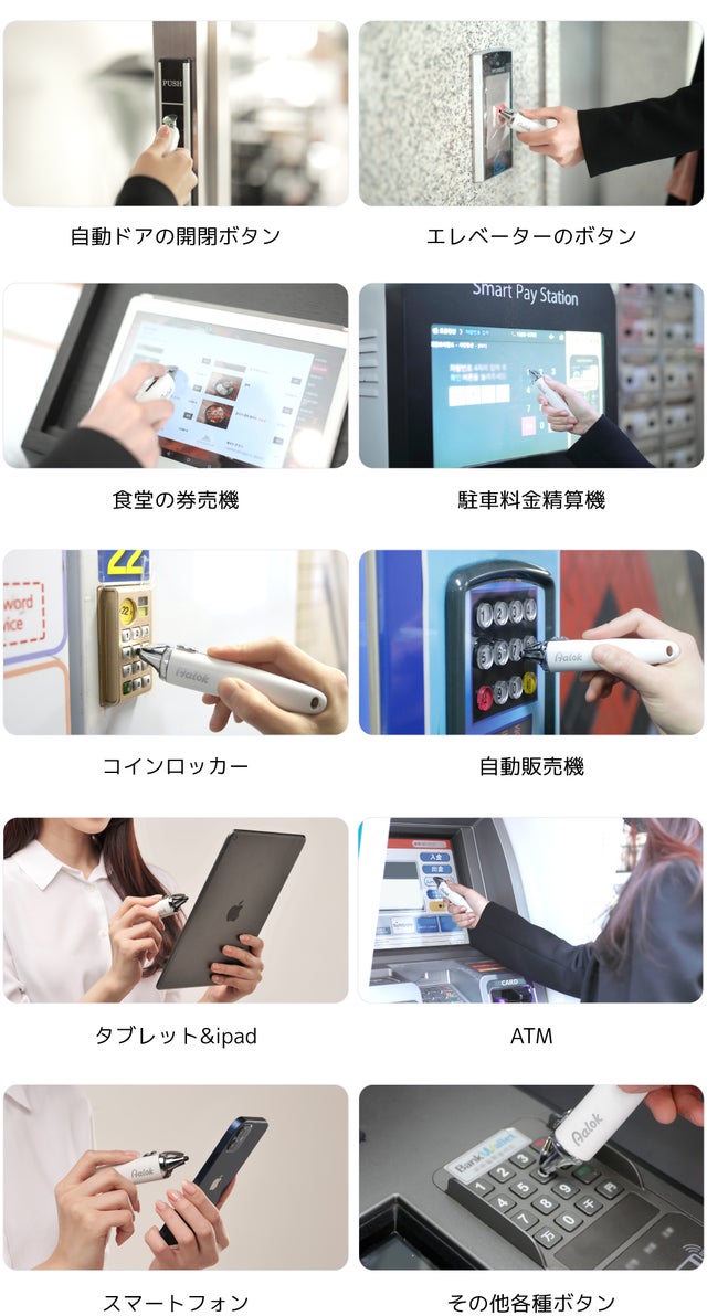 日常生活で多くの場所に存在するウイルスや細菌、出来るだけ接触しないように製作した「AalokロックUV-Cシールドフィンガー」はエレベーターのボタン、自動販売機だけでなく「スマートフォン、ATM画面」等のタッチスクリーン、食堂の券売機、駐車場の精算機など多様な場所で活躍します。