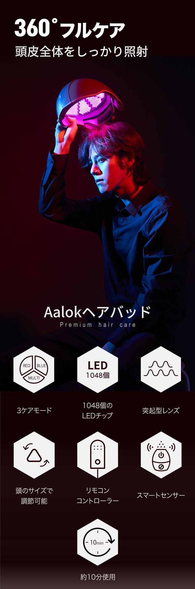 アロックの20年間の独自の技術を生かした今回ご紹介する「アロックのヘアバッド」は1048個のLED波長の光源で頭皮をケアし、毛髪を健康にケアします。