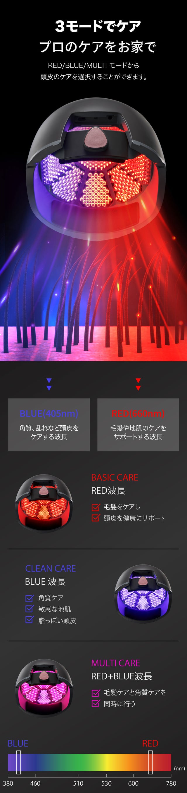 3つのLEDモードを搭載しており、頭皮の状態に応じてお使いいただけます。