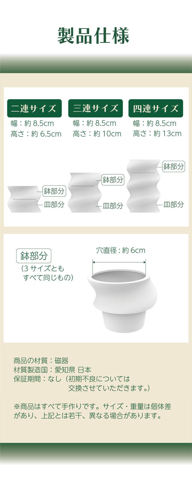 完成した鉢の3連サイズ(画像を参照)を、