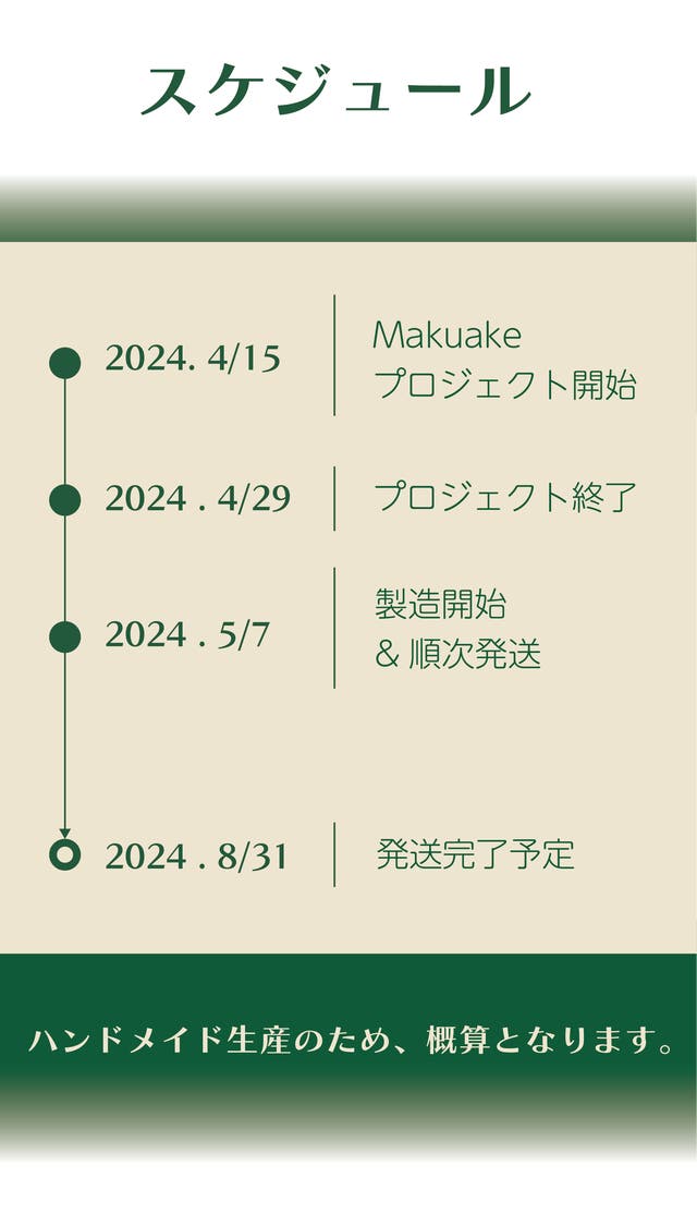 ・本プロジェクトの写真や仕様は開発中の商品情報になります。 今後、製造する段階にてやむを得ない事情により変更が発生する場合が生じます。 ・本製品はすべて手作りの為、色、サイズや重さ、模様や形状には若干の個体差がございます。 ・本製品はすべて手作りの為、予想を上回る応援購入を頂いた場合、製造に想定以上のお時間が掛かる可能性があります。その場合、予定より発送時期が遅れる可能性があります。 原則として、配送遅延に伴う応援購入のキャンセルはできませんが、リターン配送予定月から3ヶ月を超えた場合には、希望者に限りキャンセルにて対応させて頂きます。 ・上記のように、プロジェクトの内容に変更があった場合は、活動レポートにてご連絡いたします。