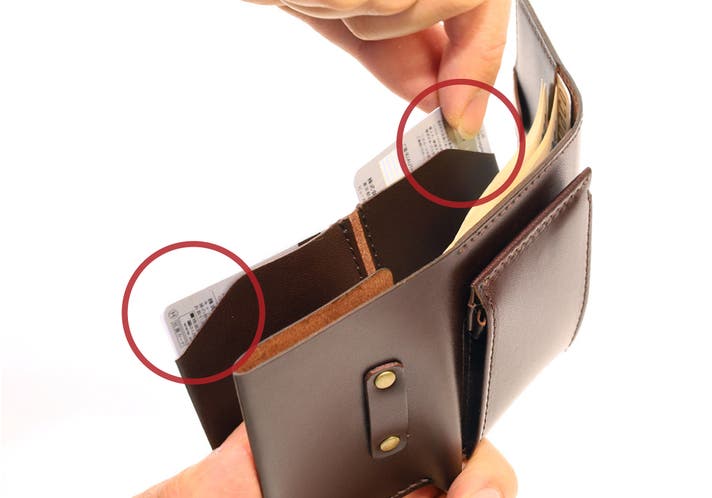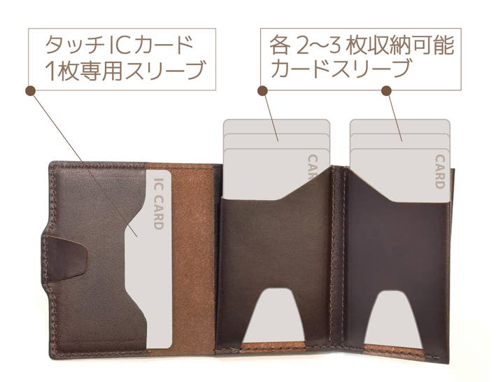 メインの左右対称の2連カードホルダーには、それぞれカードが2〜3枚収まります。