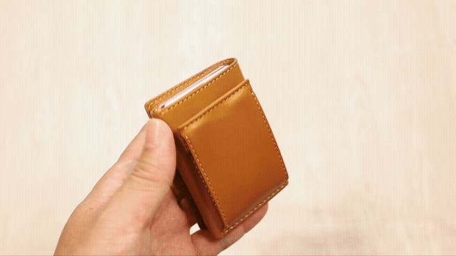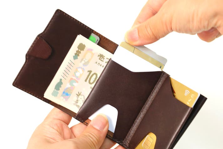 カードと同サイズの幅でありながら大きく開き見やすく、上方向に無造作に出し入れでき、お札と方向を合わせることに成功しました。