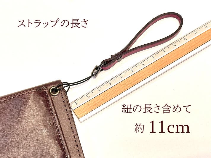 ストラップの長さは革の部分が8cm、紐の部分も入れると14cmですが、