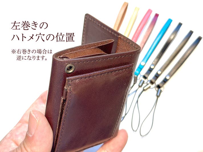 【ご注意】ミニウォレットを複数お求めの方で、例えば2個のうち1個のみハトメ穴開け加工をご希望の方は、どの色のミニウォレットにオプション加工取付をするかを必ずご記載ください。