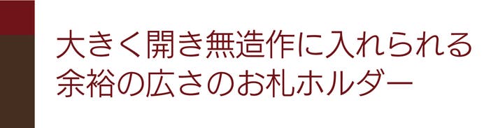 入ってるお札の確認もしやすく、また少々ズレても無造作にお札を入れられる余裕の広さを実現したワイドオープンなお札ホルダーです。