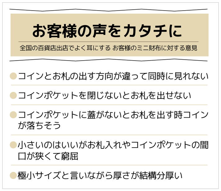 今回初めて『小さい財布』を開発するにあたり、下記のようなコンセプトを元に作り上げました。